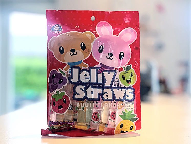 Jelly Straw Snacks Assorterede frugtsmage – jordbær, druer, ananas, grønt æble. Nem at spise! 15 gelé sugerør pr. pose.