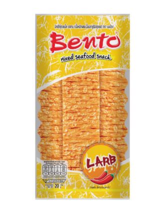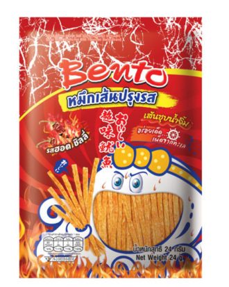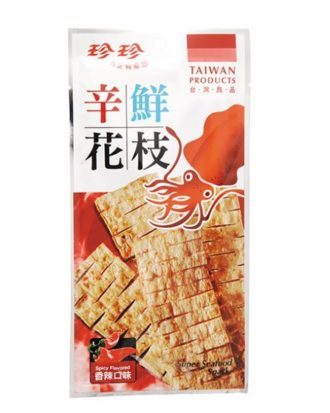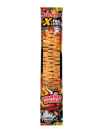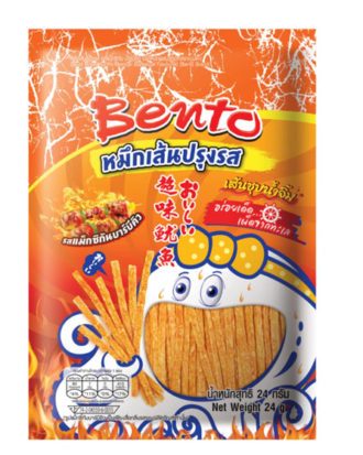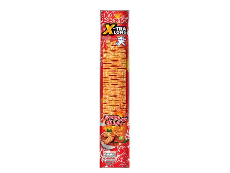 BLÆKSPRUTTE (Dosidicus gigas) 40%, SURIMI (hakket FISK (Saurida undosquamis), sukker, stabilisator (E451(i), E450 (iii)) 30%, HVEDEMEL, sukker, chilisauce 5%, fugtighedsbevarende midler (E420(ii)), tapiokastivelse, SOJASAUCE, rismel, salt, chilipulver 0.5%, KRABBE aroma, korianderpulver, JORDNØDDE aroma, chili aroma, smagsforstærker (E621, E635, E640), sødestoffer (E955, E951), aroma. Indeholder sødestoffer og kilde til phenylalanin.