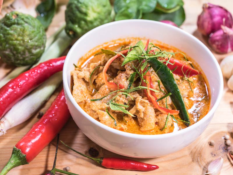 Tørret rød chili (27%), citrongræs, skalottenløg, hvidløg, salt, Kaffir limeskind, Galangal, komidepulver, korianderfrø.