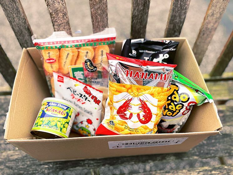 Denne kasse indeholder alt fra populære koikeya teriyaki chips, bin bin crackers, hanami rejechips og meget mere…