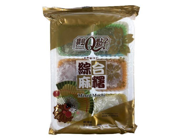 Ingredienser: Maltose (25%), sukker, glutinøs ris (20%), fortykningsmiddel: (E1442), røde bønner pasta [røde bønner, sukker, maltose, palmeolie], taro pasta [taro, sværd bønner, sukker , maltose, palmeolie], grøn te-pasta [grøn te-pulver, sværdbønner, sukker, maltose, palmeolie], grøn te-pulver, palmeolie, smag, konserveringsmiddel: (E200), farve: ((E133), (E102*), (E129*)). Indeholder: Azofarvning ((E102), (E129)): *Kan påvirke aktivitet og opmærksomhed hos børn negativt. Kan indeholde spor af allergener SESAM og JORDNØDDER