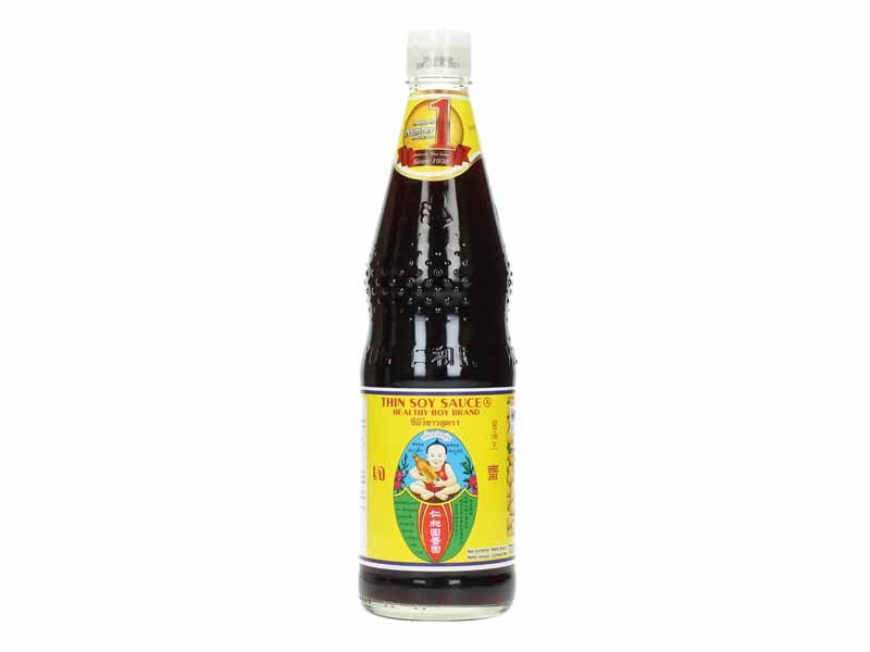 Healthy Boy lys sojasauce (også kendt som si-ew kao på thai). Denne type sojasovs er perfekt afbalanceret og saltet i smag end den thailandske mørke sojasovs.
