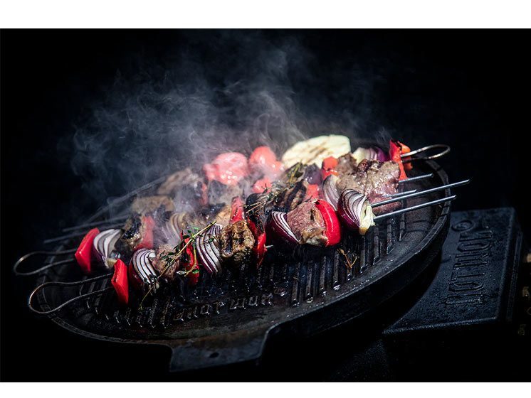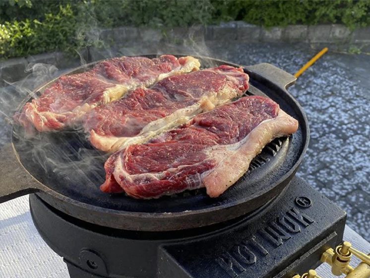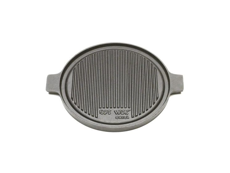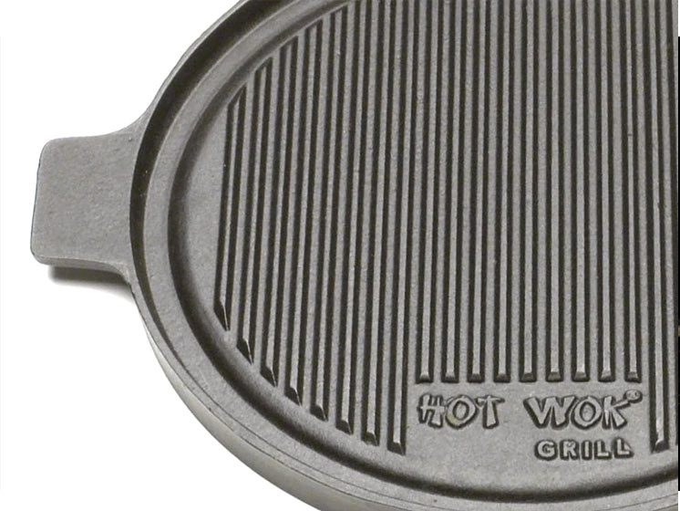 Forsiden af HOT WOK Grillpan er perfekt egnet til både traditionel fastfood og bøffer. Bagsiden af HOT WOK Grillpanden kan bruges som pande til fx pandekager.