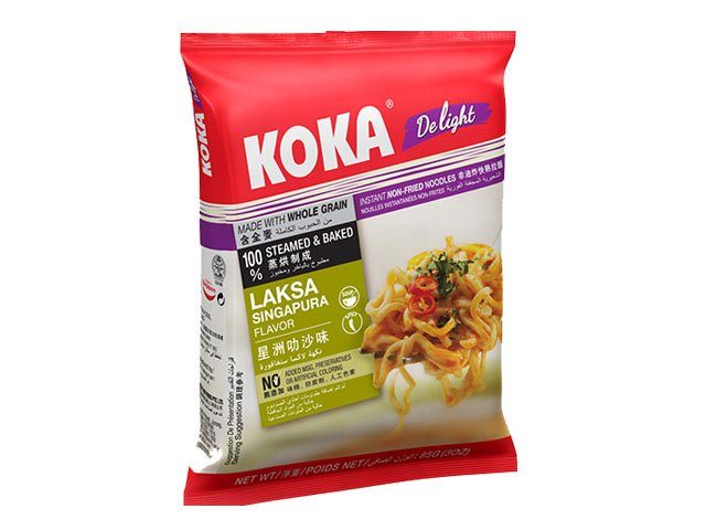 Nudler (16% fuldkorn): HVEDEmel, fuldkornsmel, tapiakastivelse, salt; Krydderier: kokospulver (MÆLK), sukker, salt, rapsolie, SKALDYRsekstrakt (REJER, FISK, KAMMUSLING, salt), gærekstrakt, hydrolyseret SOJAprotein, løg, chill-flager, ingefær, koriander, citrongræs, gurkemeje, smagsforstærker E635 (fra laksa-smag (SELLERI), chiliolie.